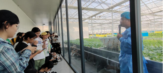 师生们首先参观“智慧农业馆”。馆内所展示的“三产融合、四链同构”高质量发展模式、现代农业设施运作方式,让师生对现代都市农业的智能化、集约化与高效化有了直观认识。对比传统人工劳动,同学们体会到科技赋能劳动下的智慧农业所带来的高效与便捷。