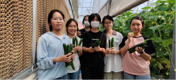同学们第一次看到布满科技辅助设备的现代化的蔬菜大棚。大家亲手采摘鲜嫩的“水果黄瓜”,品尝到了水果黄瓜的香甜,引发同学们进一步思考与探究农作物与环境的关系,思考可持续农业发展模式……