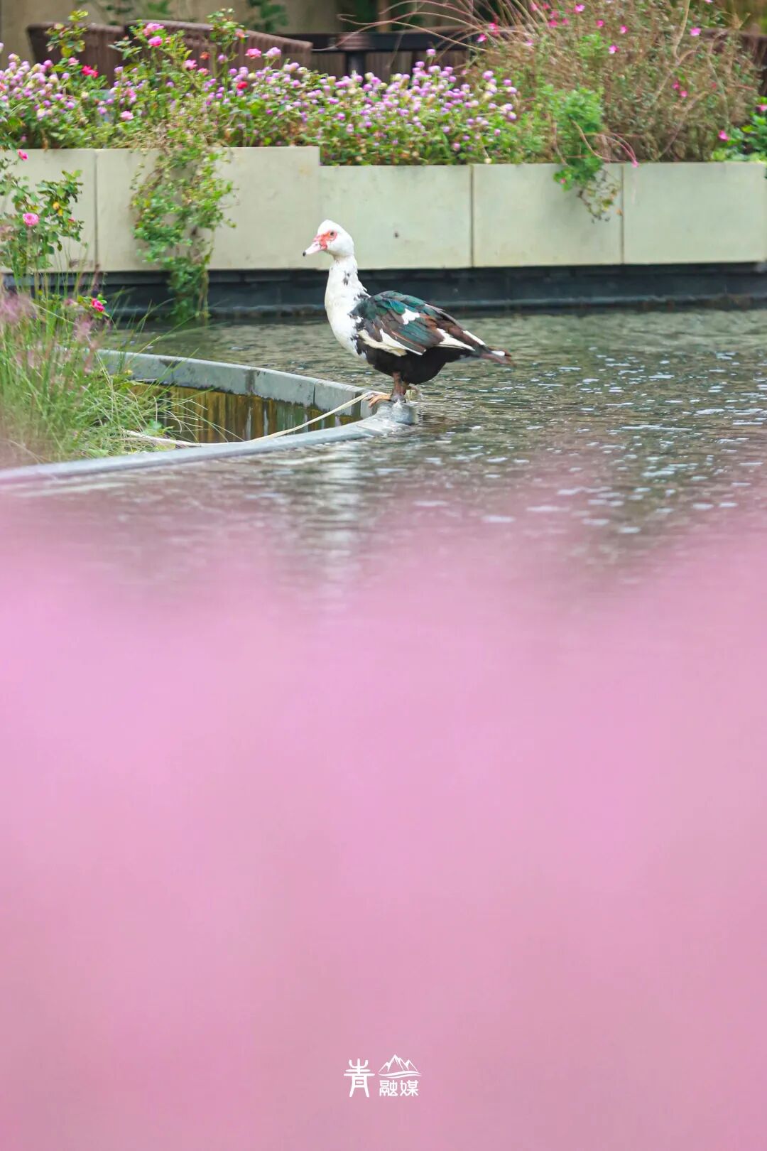 水雾弥漫,人在景中游,有金鱼在池中游弋,滕(téng番鸭)在草地漫步,小小生灵们为这方浪漫的天地,增添了更多的灵动与活泼。