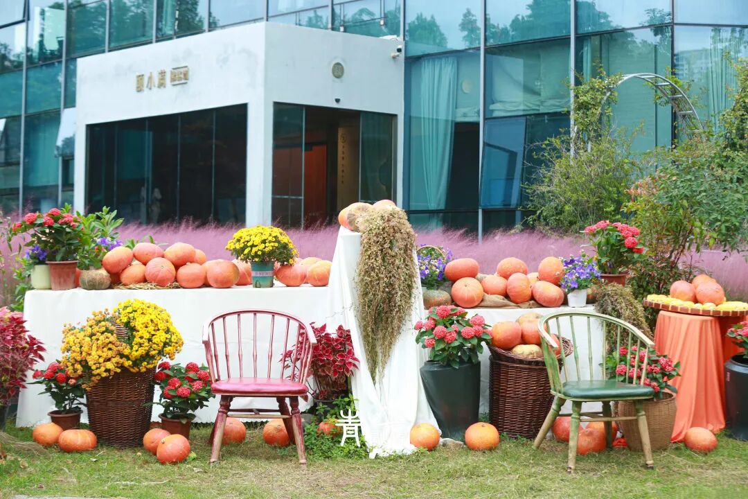 金色南瓜、鹅黄芦草、丰硕的玉米编织着金色的“晒秋”童话,三角梅吐露着芬芳,各色菊花争奇斗艳,都成为了这片粉红花海的最佳配角。
