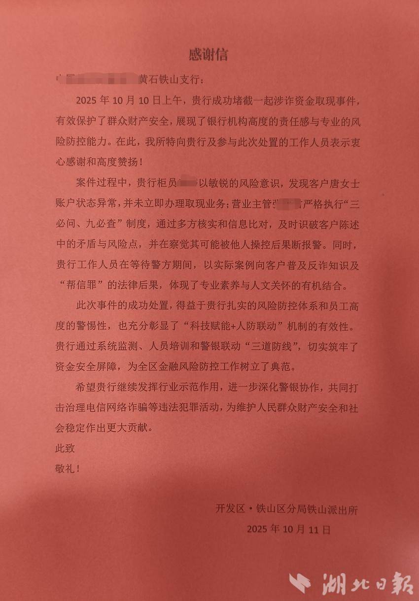 (通讯员 熊静怡 刘晓晓)10月12日,黄石市公安局开发区·铁山区分局铁山派出所民警来到辖区内一家银行,将一封感谢信交到银行工作人员手中,感谢他们凭借高度的责任心与警觉性,及时拦截了一笔5万元的涉诈资金,有效守护了市民的“钱袋子”,避免了当事人触犯法律。