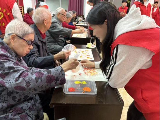 活动现场,金色家园老年公寓内欢声笑语不断。文艺汇演率先登场,大学生志愿者深情演唱《感恩的心》,歌声悠扬,饱含着对长辈的感激与爱戴,让不少老人眼眶湿润。随后,朗诵《九九秋光里,致敬岁月长》声情并茂,将两代人的心灵紧紧相连,传递出尊老、敬老的传统美德。互动环节精彩纷呈,“巧手生花”手工区里,志愿者耐心指导老人用保鲜袋绘制秋景,老人们发挥创意,一幅幅色彩斑斓的作品诞生,成为珍贵的节日纪念。“锻炼游戏”互动组活动中,趣味游戏让老人们乐在其中,笑声不断。“倾听时光”陪伴组里,志愿者与老人促膝长谈,倾听他们的过往。“生活帮手”关怀组则主动为老人整理床铺、清扫房间,用实际行动诠释尊老爱老。活动尾声,老人们与志愿者共同展示创作成果,并合影留念,定格这温馨美好的瞬间。
