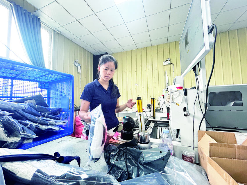 扫描货物、自动匹配订单、吐出包装袋、丢进货物、自动封口……近日,在天门莱依窕服饰打包车间,全自动打包机几秒钟就可以打包一单。该公司引进10台全自动打包机,一天可打包5万个订单,相比人工打包效率明显提升。湖北日报客户端讯(通讯员陈飞 摄)