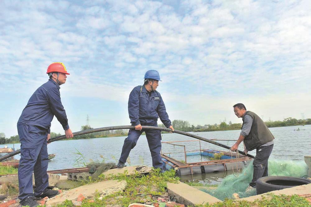 供电员工与当地养殖户协同配合,共同加固绝缘导线、清理渔网周边隐患,全力提升线路抗风雨能力,保障水产养殖用电安全稳定。此次服务是国网老河口市供电公司助力乡村特色产业、护航农业生产的一个缩影。(来源:襄阳日报 郭峰 摄)