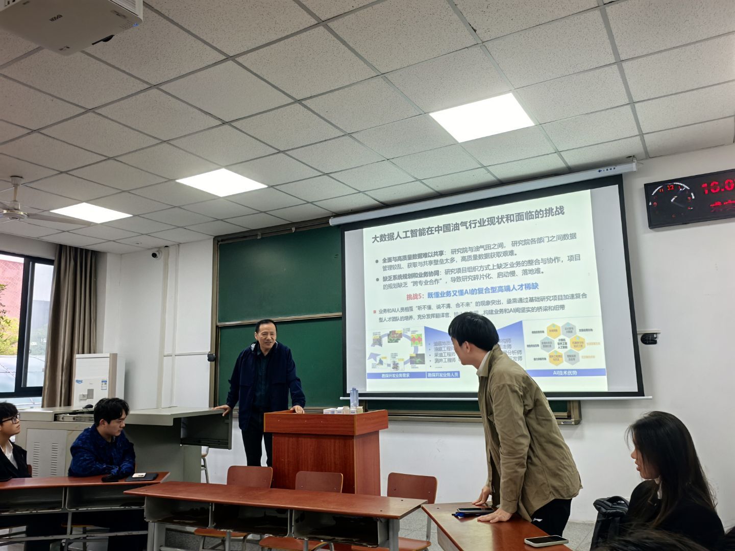 李教授聚焦人工智能与地科专业的融合及学生发展,介绍了AI在中国油气行业的应用现状与挑战。他指出,人工智能已在无人驾驶、无人机巡检等领域显著提升效率、降低风险,但地质领域因环境复杂、数据获取难、成本高等因素,应用仍面临挑战。国家正积极推动人工智能与各行业融合,高校与企业也在不断探索,为学生成长提供了广阔空间。李教授强调:“我们地科学子要抓住人工智能发展重大战略机遇,突出应用导向,推动专业知识与AI技术的深度融合。”最后,李教授鼓励大家主动学习、提早规划,为大学学习生活树立明确的目标。