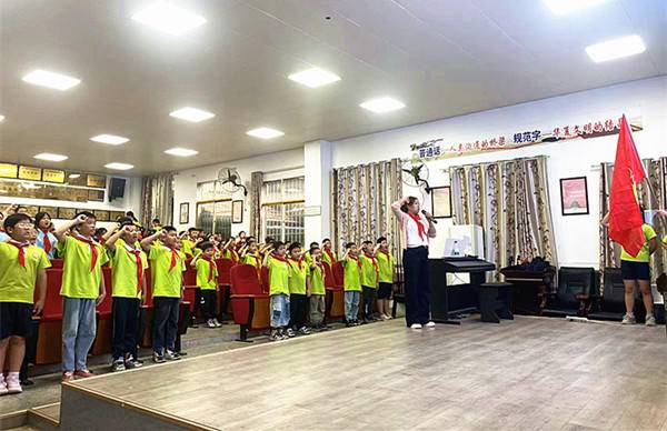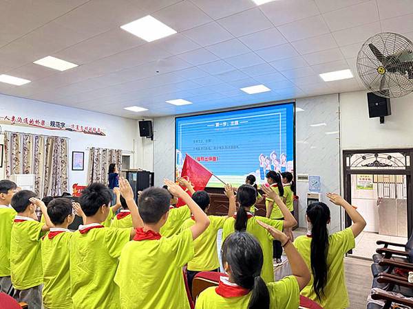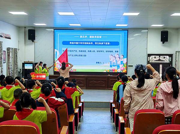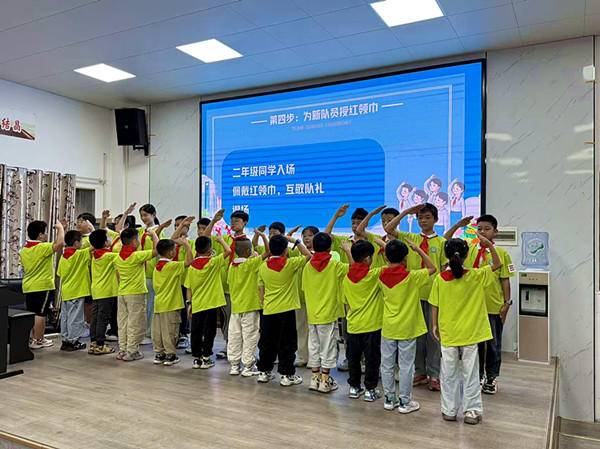 活动按规范少先队仪式流程开展。激昂的出旗曲中,旗手迈着坚定步伐护卫队旗入场,全体队员高唱《中国少年先锋队队歌》,歌声嘹亮、充满朝气。随后,少先队辅导员柯佳妮宣布 60名新队员名单,高年级优秀队员代表庄重为新队员授戴红领巾。面对鲜艳队旗,新队员高举右拳宣誓,铿锵誓言回荡校园。