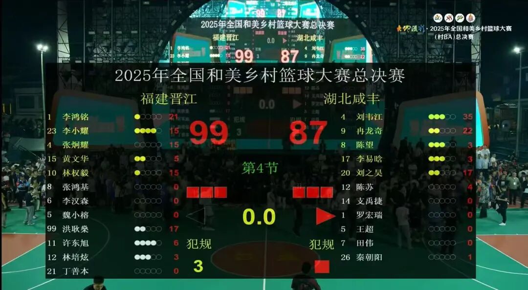 当晚8点,决赛正式打响。第一节比赛开始,双方很快就进入了状态,比赛十分激烈,比分交替领先,多次打平,首节结束,双方以24:24战平。第二节,福建晋江队加强对咸丰白茶队双子星之一4号刘韦江的包夹防守,一度将分差扩大到10分以上,节末,咸丰白茶队加强突破,逐渐将比分缩小,福建晋江队以52:46领先进入中场休息。下半场开始,咸丰白茶队双子星之一9号冉龙奇手感回暖,全队加强配合,以3分之差结束此节。第四节,咸丰白茶队一度反超比分,但对方又频频进攻得手,很快拉开分差。终场哨响,咸丰白茶队以87:99惜败福建晋江队。