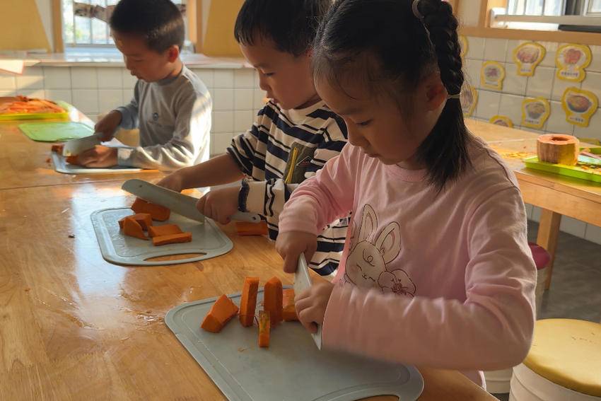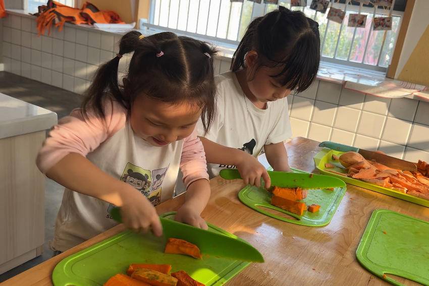 活动中,老师先带领孩子们认识各类作物,讲解“晒秋”这一传统习俗的由来;随后,孩子们分组合作,小心翼翼地将南瓜切成块。阳光下,橙黄的南瓜、火红的石榴、金黄的玉米相映成趣,孩子们的笑声与讨论声交织,既感受了秋日丰收的喜悦,也在动手实践中认识了农作物的特征。