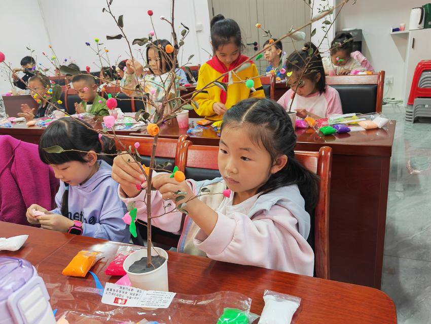 在制作环节,工作人员引导孩子们仔细观察树枝的天然形态,鼓励他们发挥天马行空的想象力。“大家看,这根树枝弯弯的,适合在拐弯的地方放上一朵花!”“这团绿色的彩泥,我们可以把它变成一片片小树叶!”在工作人员的启发和协助下,孩子们全神贯注地投入到创作中。他们用灵巧的小手将彩泥揉、捏、搓、压,精心制作出各种可爱的造型,再巧妙地与形态各异的枯树枝组合在一起。原本黯淡无光的枯枝,被赋予了新的生命,变成了一件件独一无二、童趣盎然的艺术品。活动现场充满了欢声笑语,气氛温馨而热烈。