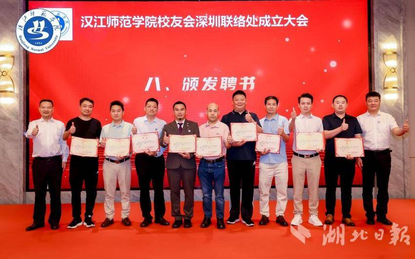 章平宣读《关于成立汉江师范学院校友会深圳联络处的批复》文件。肖德对深圳联络处成立表示祝贺并授牌。名誉会长杨志杰、校友代表王少明、李海分别上台发言,表达祝贺。与会领导为深圳联络处第一届理事会成员颁发聘书。