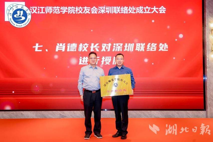 湖北日报讯(通讯员曹杨)金秋十月,鹏城暖意浓。10月18日下午,汉江师范学院校友会深圳联络处成立大会在深圳市宝安区举行。来自大湾区各地的90名校友代表与母校老师、特邀嘉宾欢聚一堂,共同见证这一时刻。学校党委副书记、校长肖德,校领导章平,物理与电子工程学院院长王绍明,校友办主任、校友总会秘书长胡江涛,以及在深相关单位领导、校友代表出席大会。会议由2002级校友刘丹、2003级校友曾令超共同主持。