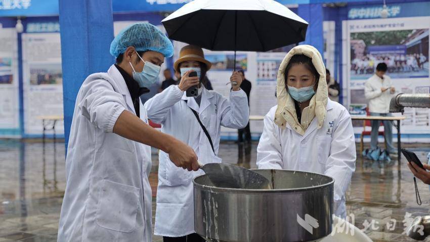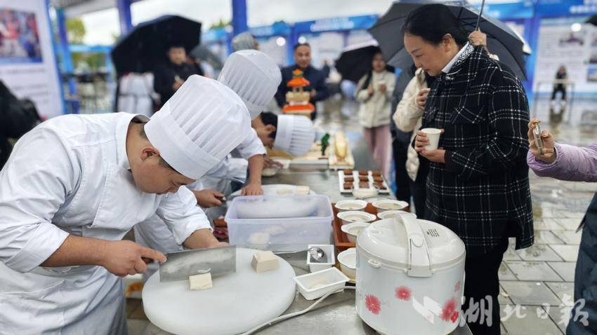 在“技能与创新展示区”,亮点层出不穷:湖北豆旺农业科技集团有限公司展示的豆粉加工流水线模型,直观呈现环保品控下的标准化生产流程;钟祥技师学院学子现场演绎“菊花豆腐”雕刻、蒙眼切豆腐丝绝技,并搭配高铁主题豆腐雕塑,让传统技艺尽显时代活力;湖北九阳豆业有限公司的多蛋白新型豆制品,印证了石牌豆腐“蛋白质含量超国标7个百分点”的原料优势。更引人关注的是产业融合新场景——大豆低空遥感监测模型揭开现代农业发展密码,低空物流场景示意图勾勒出“豆腐从田间到餐桌”的提速路径,与大赛“技兴荆楚 领航低空”主题高度契合。