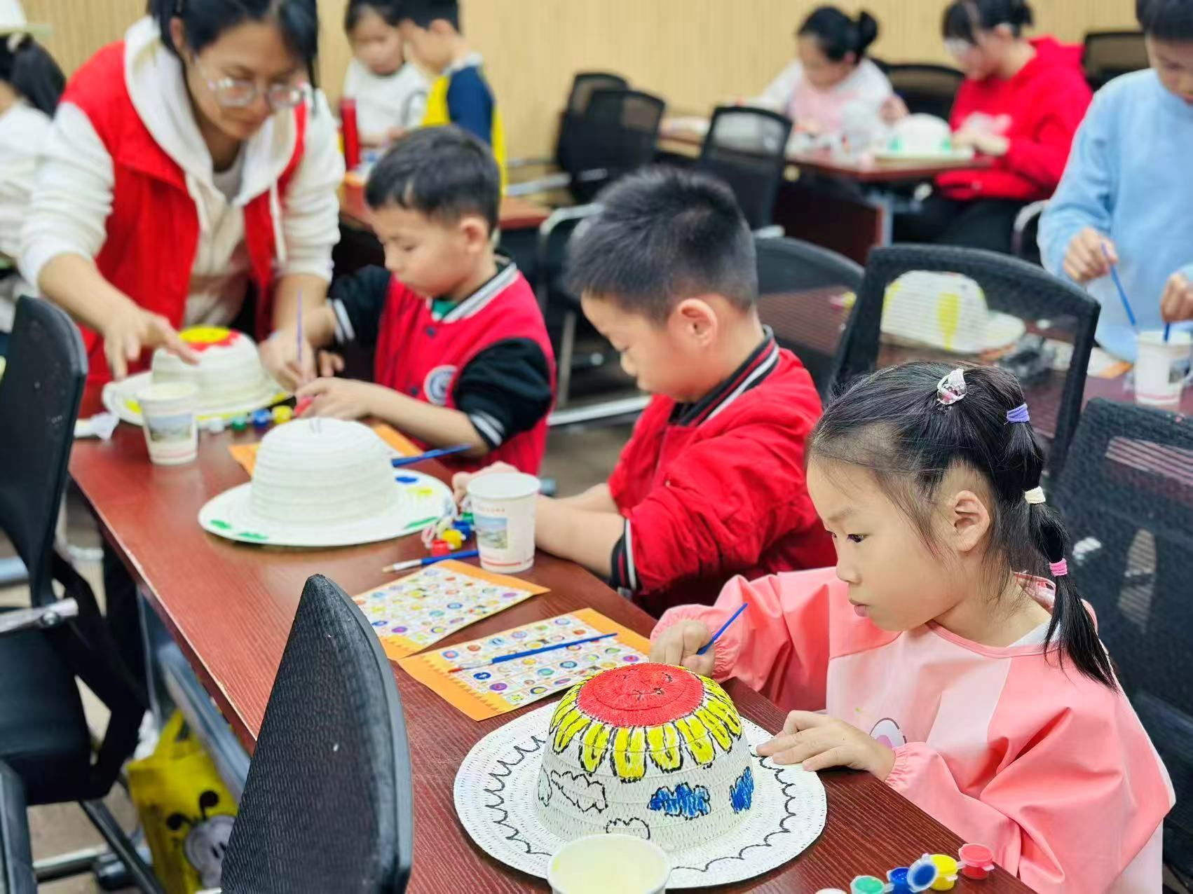 在创意草帽DIY活动中,孩子们化身小设计师,发挥无限创意。有的运用波点元素模仿艺术大师风格,有的描绘社区美景,还有的将卡通角色与自然景物巧妙结合。二年级学生小雨在草帽上绘制了向日葵,她开心地分享:“老师说过,我们就像向日葵,永远向着阳光成长!”手工课上,钱老师耐心指导每个孩子,活动现场洋溢着欢声笑语。