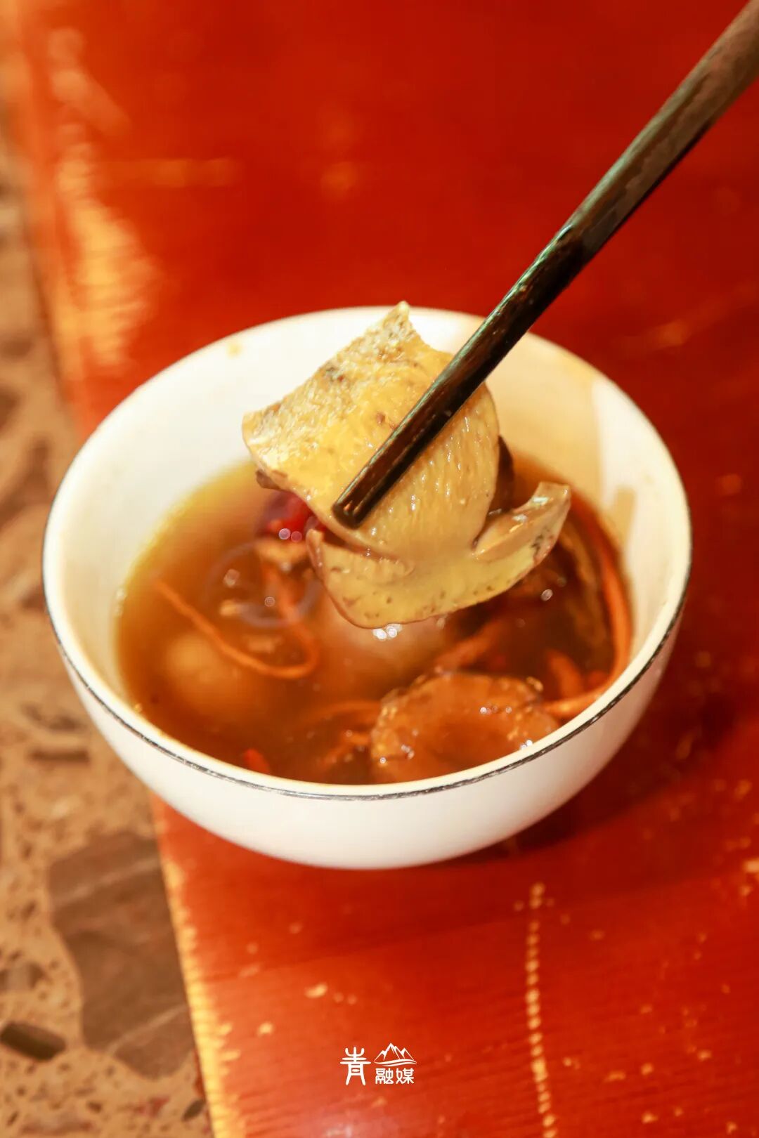时间到,一股极其复杂而霸道的香气“轰”地扑面而来,那不是任何一种调味料能调出的味道,是浓缩了整个云南山林的精华——有松林的馥郁、泥土的芬芳、雨后草木的鲜活。原本清亮的鸡汤此刻已镀上了一层诱人的金黄,汤面滚着细密的油花,每一勺都挂着浓郁的胶质。