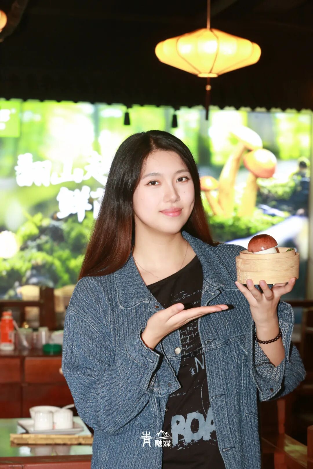 厅内陈设着原木桌椅,灯影透过素纱灯罩,在斑驳的木纹上投下温润光晕。壁上悬着墨色大字,题着“启牛山珍”几个大字。