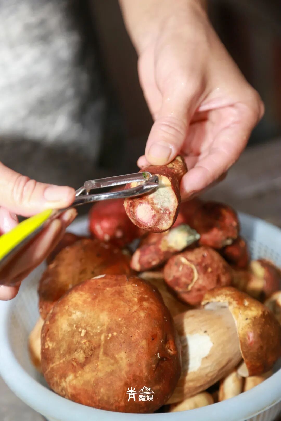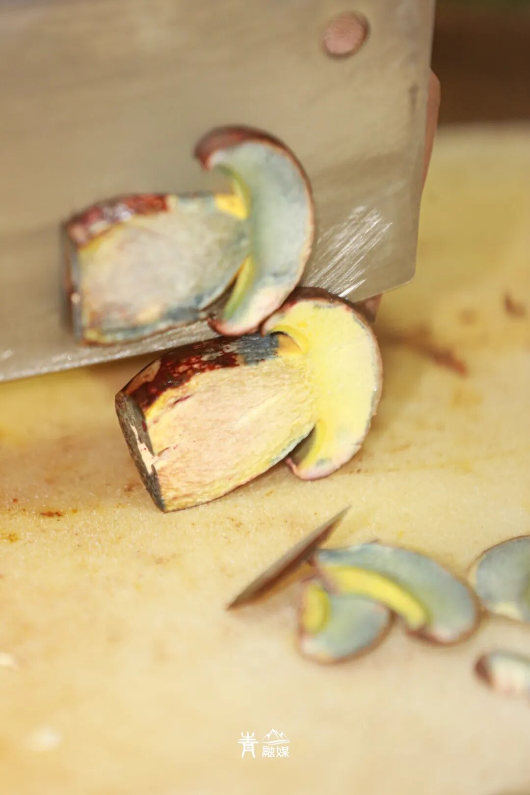 见手青一切就变青蓝色,下锅却恢复橙黄,像是山里的变色龙。松茸片一烫就卷成小喇叭,牛肝菌胖墩墩的像迷你面包。