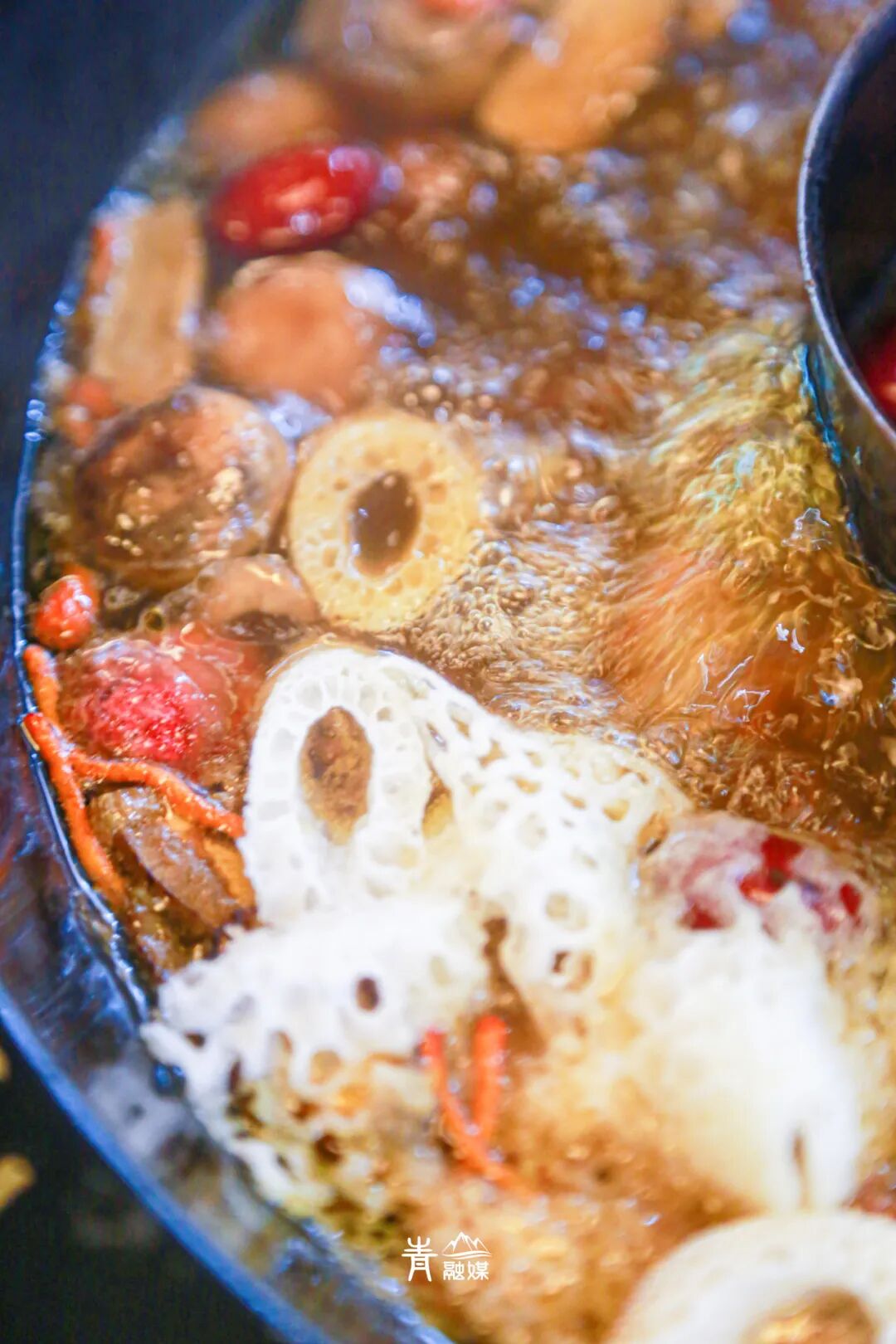 除了每日现采空运的鲜菌之外,土鸡汤也是每日小锅现熬,来自黄陂自有山头散养两年的老土鸡,熬成一锅泛着鸡油,浓醇鲜香的鸡汤汤底。