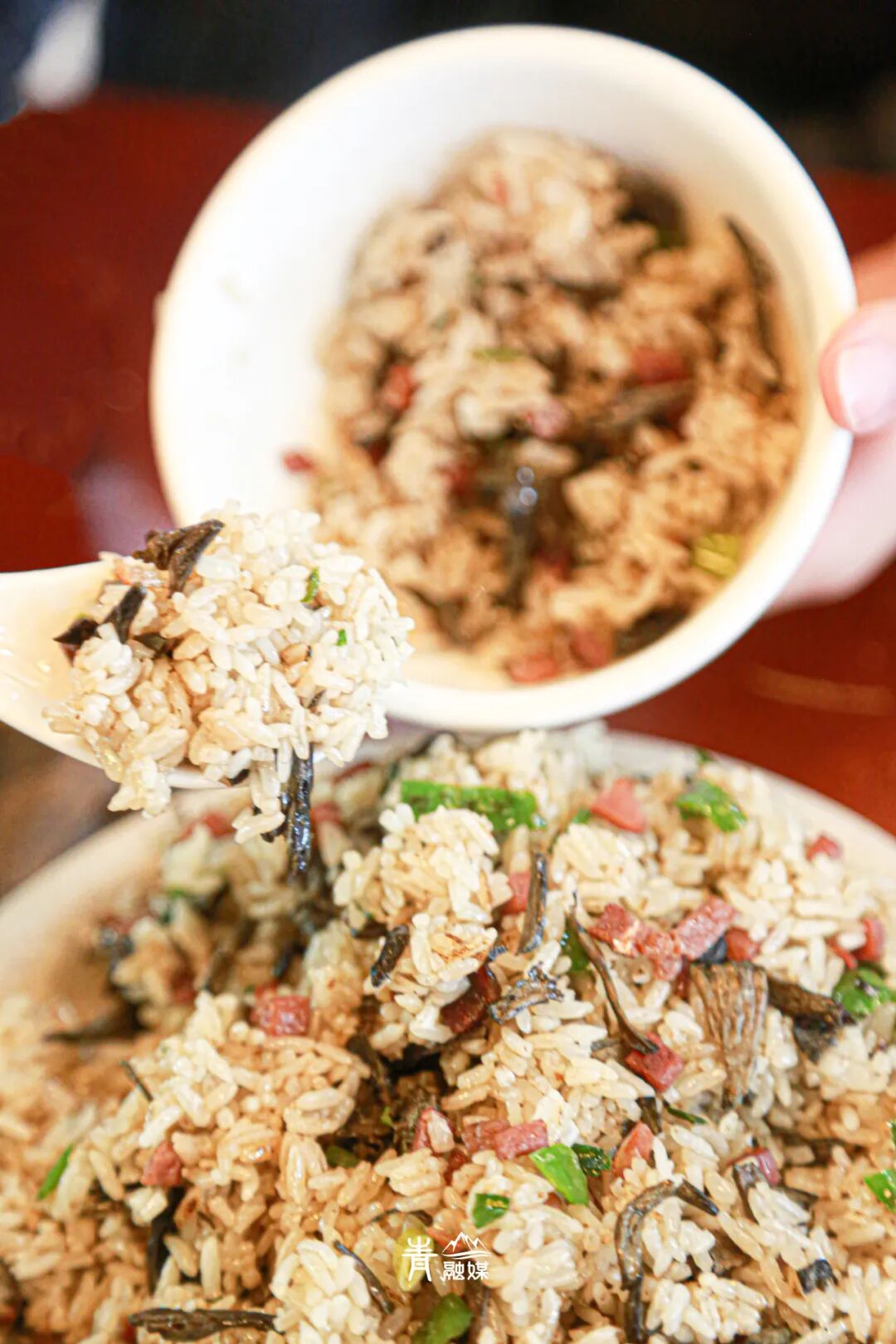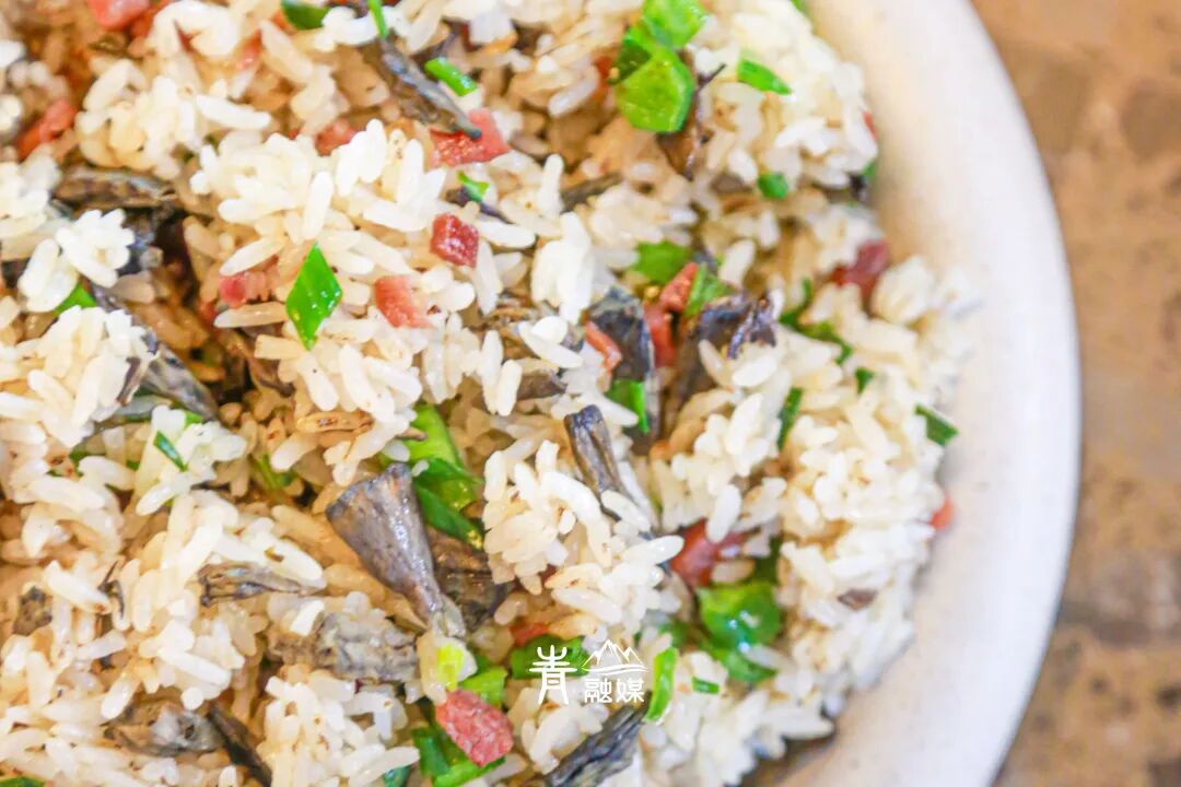 「干巴菌炒饭」干巴菌切厚片,在热油里激出霸道的香气。倒入米饭快速翻炒,每一粒米都吸饱了菌子的精华,变得油润光亮。菌片肥厚滑嫩,锅气与野性香气交织,成就一盘至鲜炒饭。
