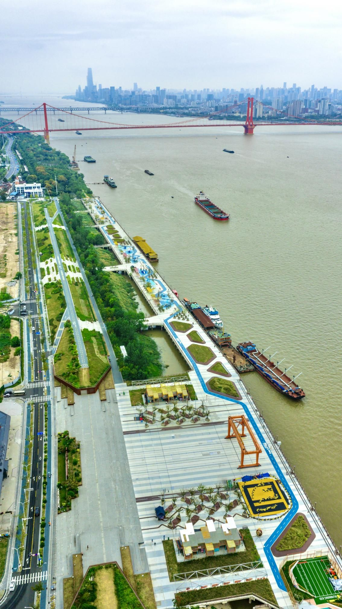从工业记忆到生态秀场,杨泗港都市T台的蝶变则成为武汉长江岸线转型的典型缩影。这里的前身,是始建于1959年的杨泗港货运码头,曾是长江中上游最大的国际集装箱转运码头、我国内河航运第一大货运港,见证过“长江黄金水道”的辉煌与汉阳工业的发展历程。随着武汉推进长江工业岸线转型,2010年货运功能外迁后,码头一度沦为废弃之地。2020 年武汉启动百里长江生态廊道建设,杨泗港都市T台作为重点示范项目,在碧水集团的打造下,以“保留城市记忆、修复生态环境”为核心,保留原有高桩平台、龙门吊、铁轨等码头元素,通过“生态缓坡堤防+拼装式防洪墙”的创新设计,弱化“江、滩、堤、城”界限,构建起“一轴、三段、五节点”的景观空间结构,打造出长江中游地区最宽的江滩闸口、江上玻璃栈桥、国风篮球场等特色设施。