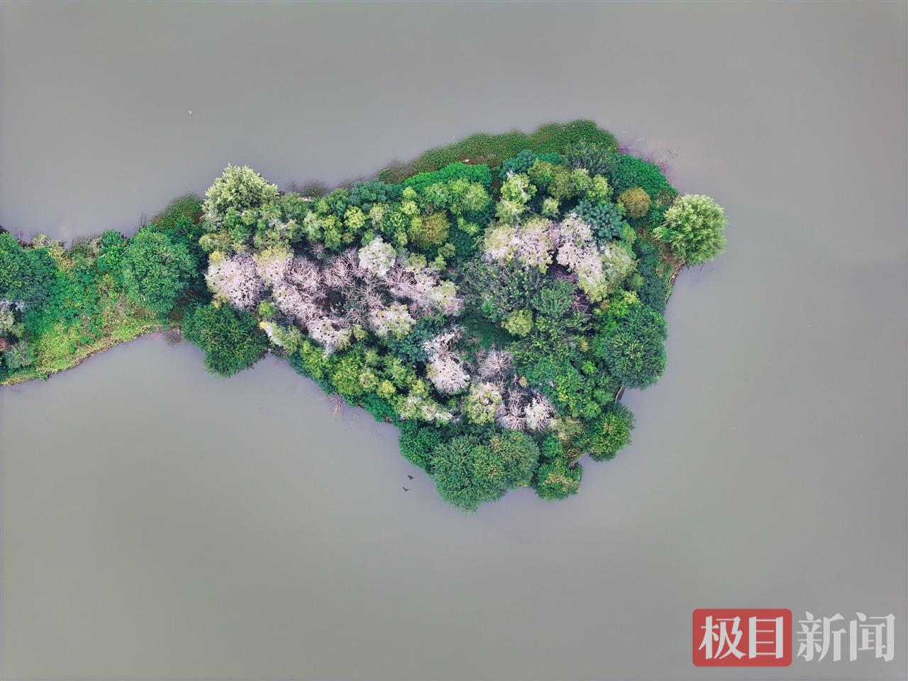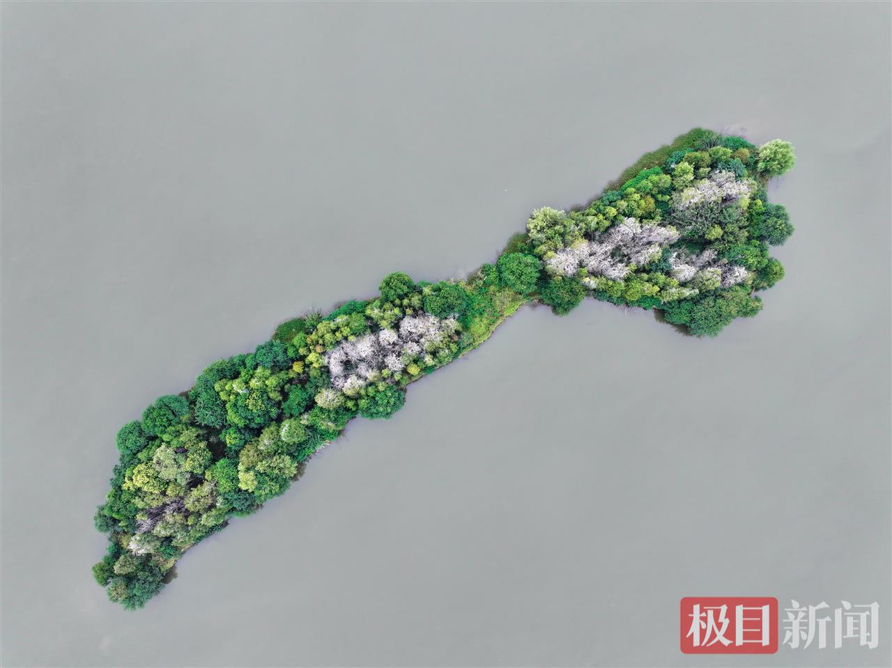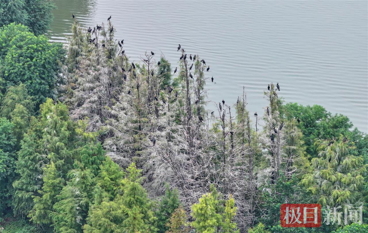 湖北日报讯(通讯员宋枕涛)又到了一年候鸟迁徙季。近日,武汉东湖落雁景区的“走人棋鸟岛”上迎来一批鸬鹚,它们将在这里停留越冬,捕鱼为食。10月17日,记者在现场看到,湖心小岛的树梢上停满了通体乌黑的鸬鹚。从高空俯瞰,湖心岛中心区域仿佛覆盖了一层白雪,与周边绿油油的枝叶形成强烈反差。实际上,这是鸬鹚的排泄物把树木染成了白色。