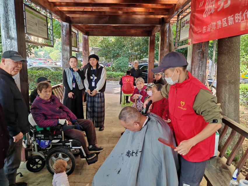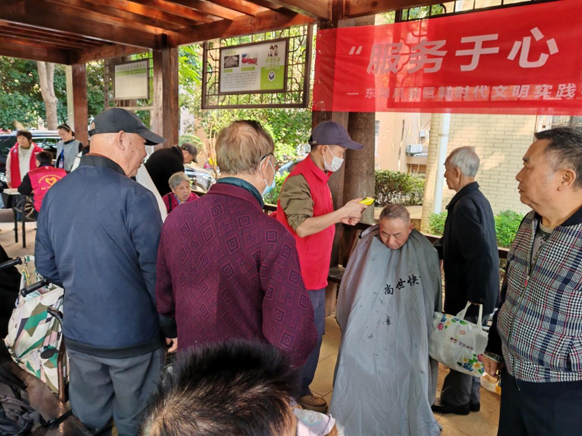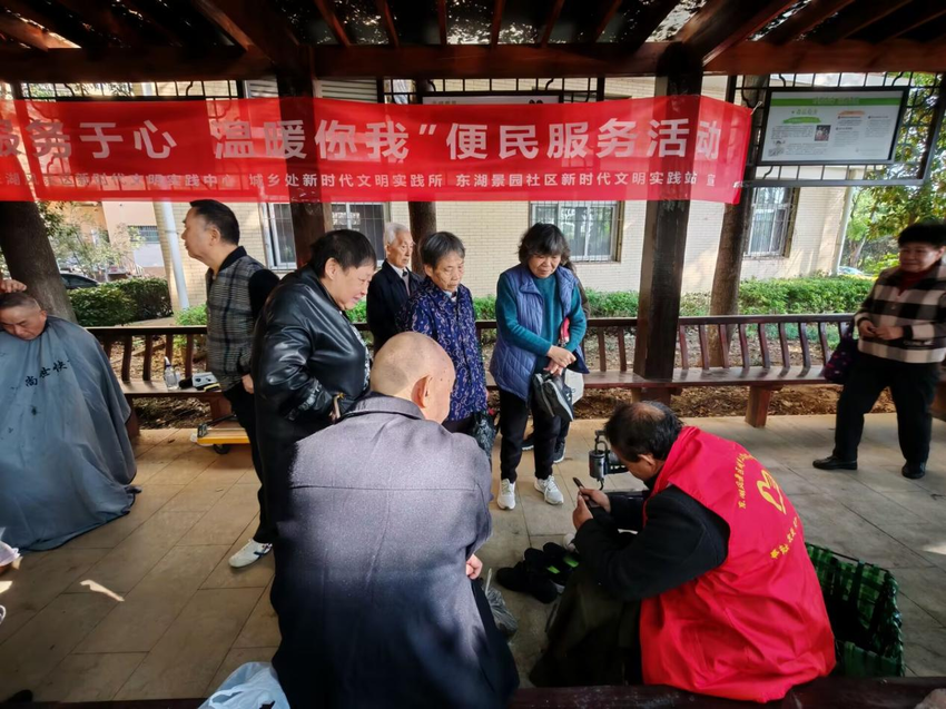 湖北日报客户端讯(通讯员苏冉)金秋送爽,丹桂飘香。值此重阳佳节来临之际,为弘扬尊老敬老传统美德,东湖景园社区于10月23日上午在A区睦邻亭开展“服务于心,温暖你我”便民服务活动,为辖区60岁以上老年人提供免费理发、修鞋、修伞等贴心服务。