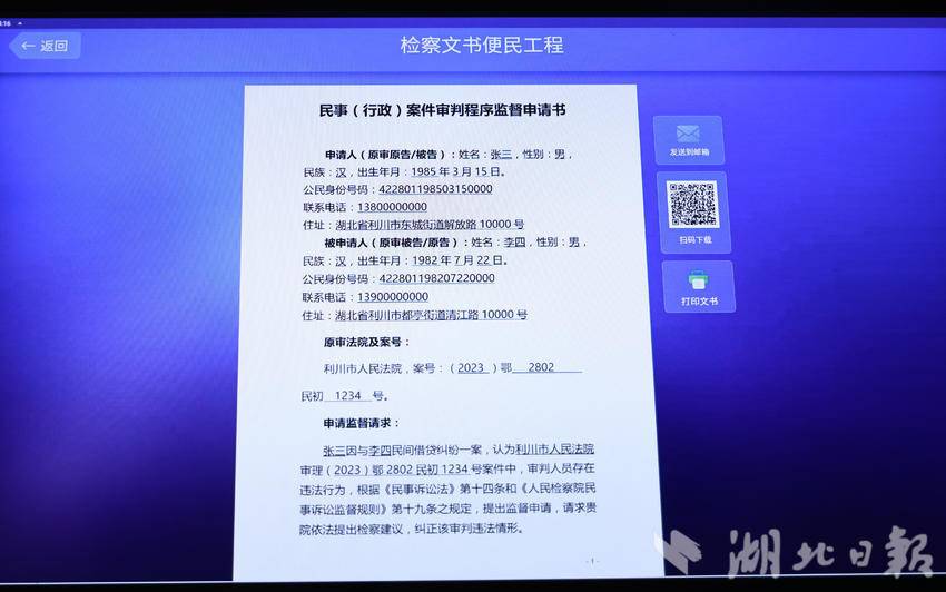 今年9月,利川市检察院12309检察服务中心收到群众老李来信,因其申请材料中诉求表述不清,检察官主动回电沟通,确认其真实诉求为申请民事执行监督。随后,检察官通过智慧检察服务平台将民事执行监督申请书的模板与范本发送至老李邮箱。三天后,老李重新提交了材料齐全、符合受理条件的申请,目前该案已进入办理程序。