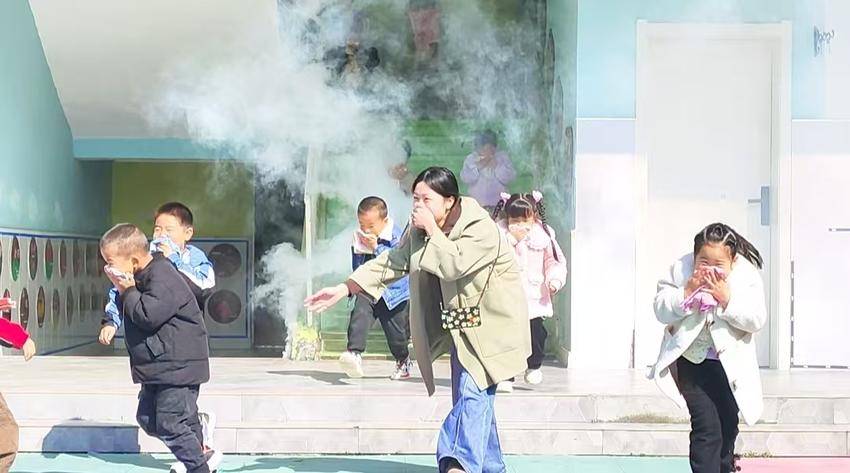 随着消防警报声和地震预警信号的响起,消防地震演练正式开始。烟幕弹释放的安全烟雾迅速弥漫在指定区域。正在教室里进行活动的老师们迅速组织幼儿用湿毛巾捂住口鼻,弯腰低姿,按照预定的疏散路线有序撤离教室。同时,各楼层的安全引导员也在第一时间到达指定位置,协助疏散队伍快速、安全地通过楼梯、走廊等区域,确保疏散过程中不发生拥挤、踩踏等事故。到达操场后,各班级教师迅速清点人数,并向演练总指挥报告。整个疏散过程只用了1分多钟,做到了快速、安全、有序。