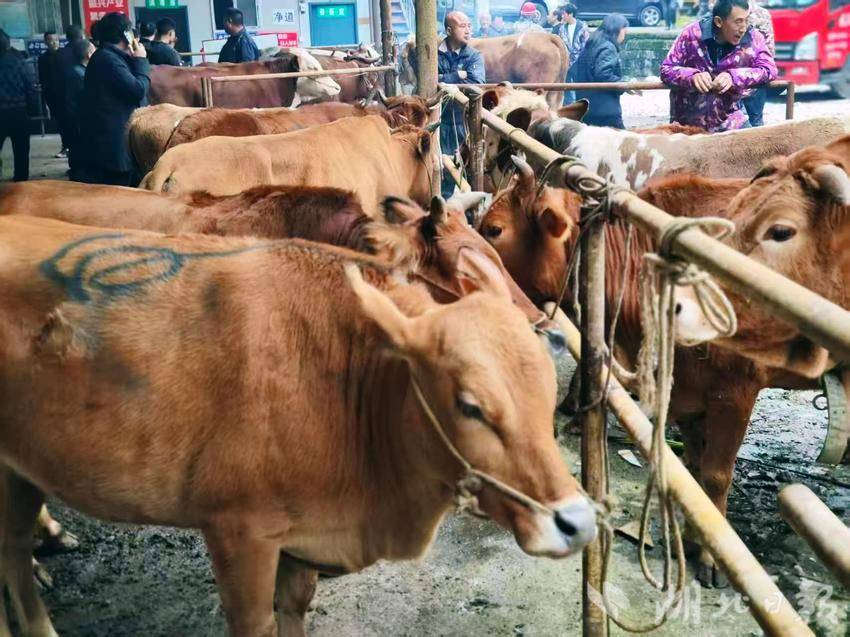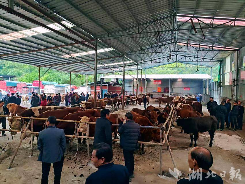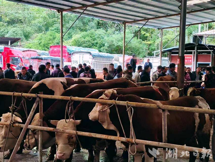 开市当日,市场内人声鼎沸,牛铃声、吆喝声和议价声,此起彼伏。来自湖北、湖南、重庆、贵州4省(市)边区的客商和当地养殖户聚集于此,看牛、议价、过磅,交易忙而有序。这个交易市场的建成,填补了咸丰县规模化肉牛交易平台的空缺,为推动武陵山区畜牧产业发展增添了动力。