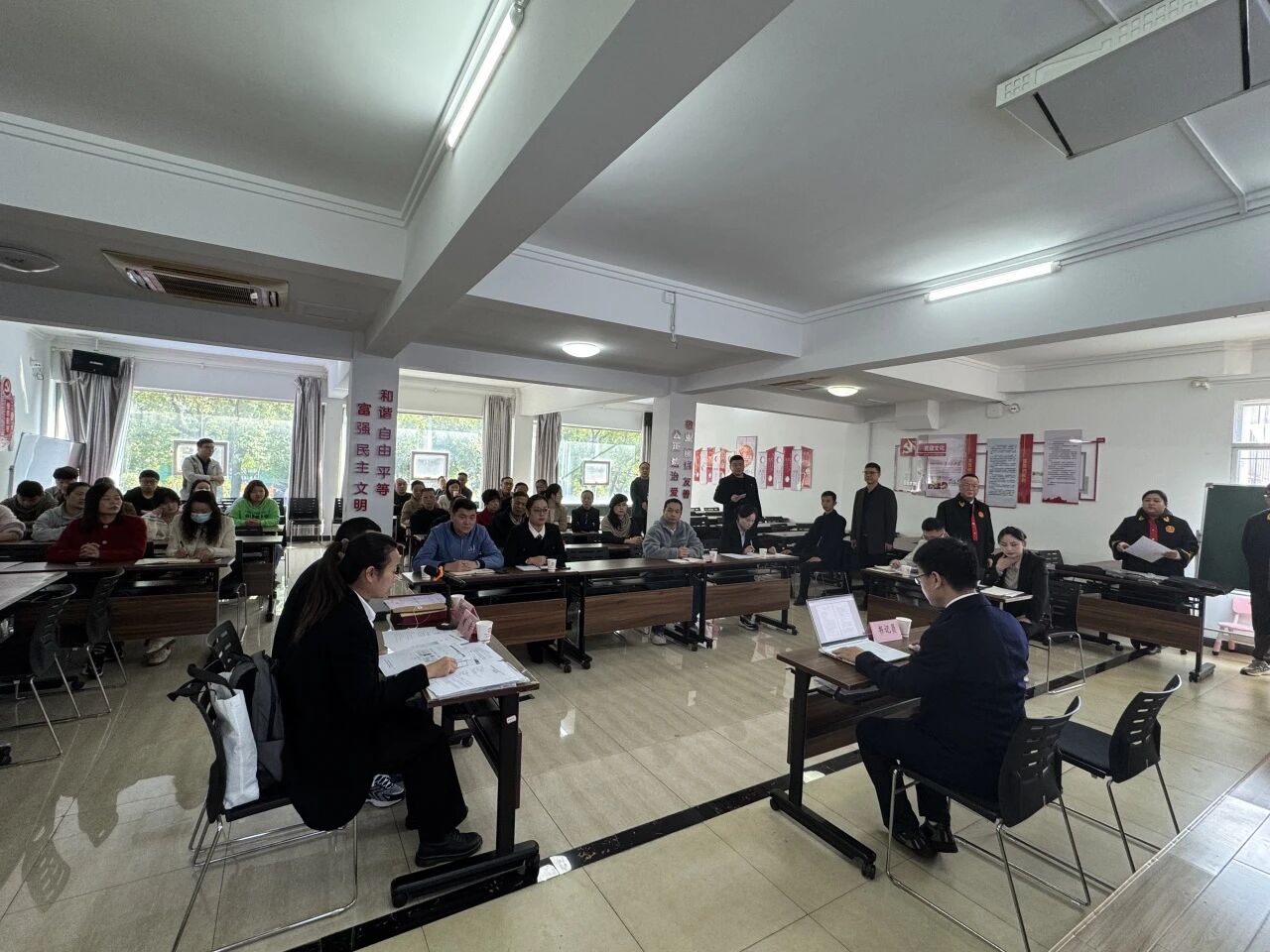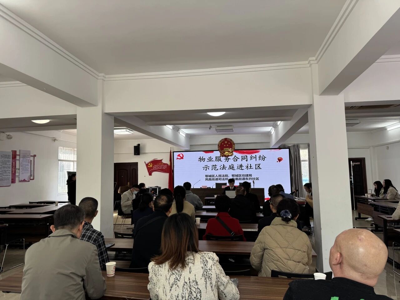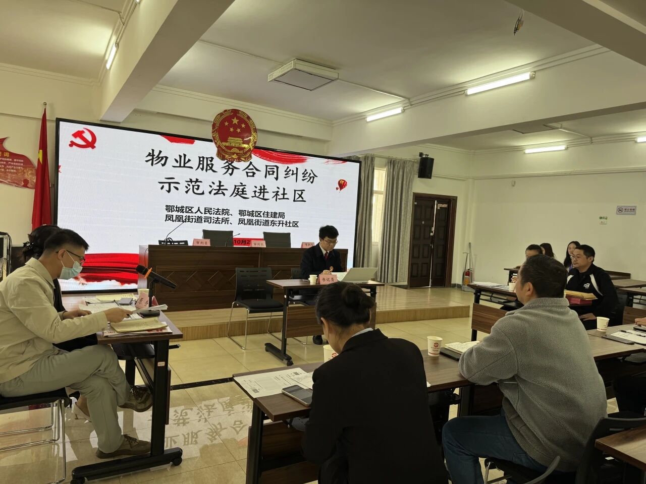 10月23日,东升社区首次创新引入示范法庭进社区,联合鄂城区人民法院、区住建局、凤凰街道司法所,将物业服务合同纠纷庭审“搬”进社区活动室,以“真实庭审+普法宣传”的形式上了一堂生动的法治实践课。