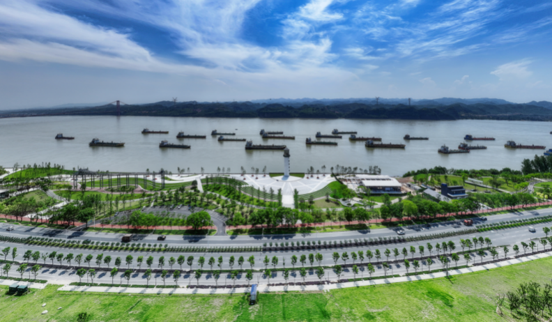 灯塔广场所在地原为磨盘港码头,主要装卸磷矿石、砂石料、钢材等,场地内有库房、传送架、磅房等功能性构筑物,从空中看,磨盘港码头大面积的场地硬化犹如长江岸线的“疤痕”,对岸线生态破坏较为严重。2019年,宜昌市园林中心启动长江岸线整治修复项目(柏临河入江口至猇亭古战场段),秉持破旧立新、修旧换新的理念,从场所记忆和地域文化出发,拆除部分老旧建筑,对库房、传送带等码头特色构筑物进行保留改造,其中:库房变身为文创展示中心,传送架上新增了网红秋千。新建的灯塔则与海事部门雷达站相结合,将功能与景观和谐相融。