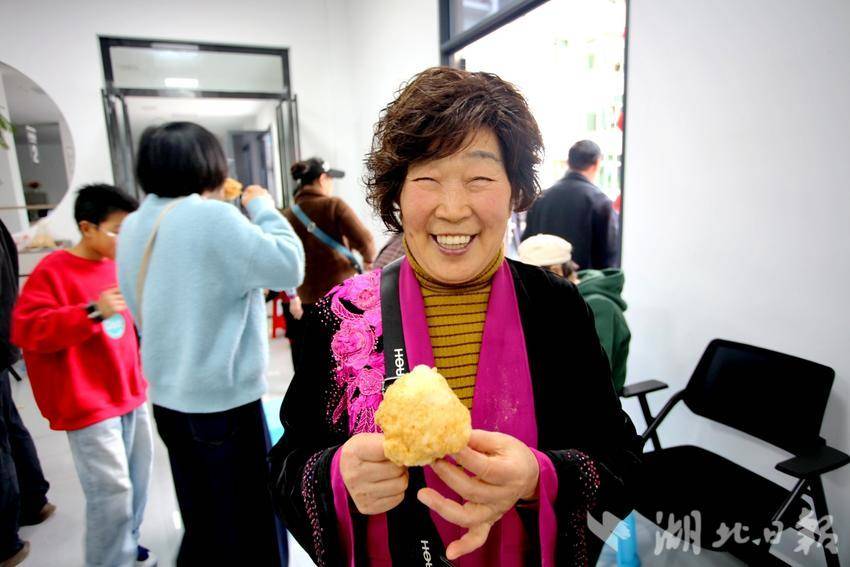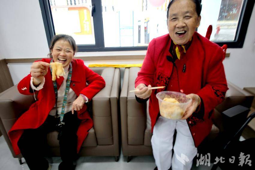 不一会儿,软糯的糍粑打好后被分成小团,粘上白糖和豆面,送到每个老人的手中。老人们品尝着香甜的糍粑,赞不绝口。一位老人开心地说道:“这古法打出的糍粑是我们小时候的味道,真是好吃,让我们感受到了社区对我们的关心。”