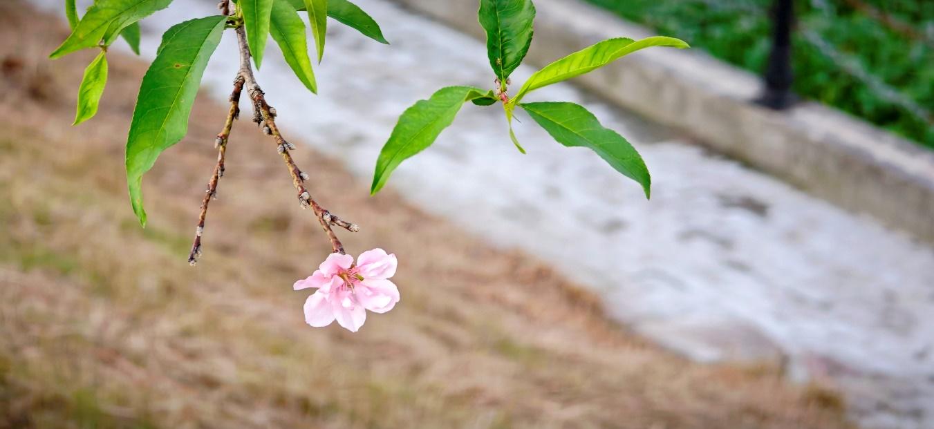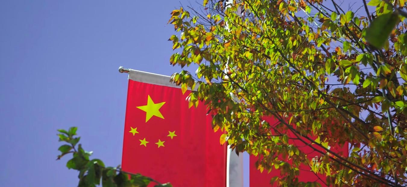 偶有一枝早开的粉色花朵点缀在步道旁,与蓝天下飘扬的国旗相映,让这份幸福里又多了几分生动与温情。