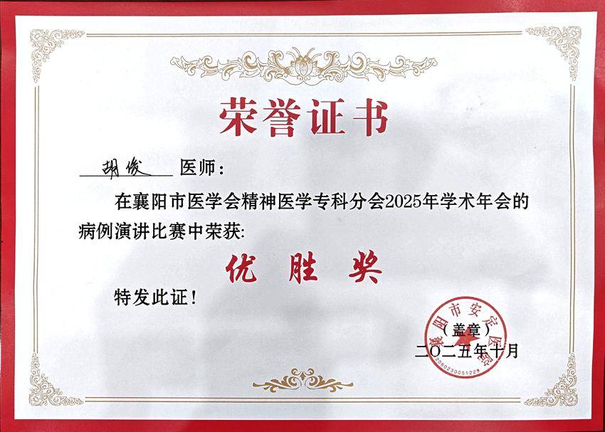 湖北日报客户端讯(通讯员何继海)近日,在2025年襄阳市医学会精神医学专科分会第二届病例演讲竞赛中,谷城县人民医院精神心理科胡俊凭借个案“一例老年患者术后反复谵妄的MDT诊疗体会”,历经多轮激烈角逐,荣获优胜奖。