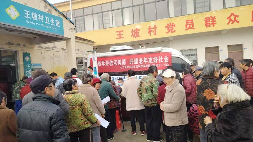 在七方镇王坡村,医务人员仔细为65岁以上老年人免费检测血压、体重、心电图、B超、肝肾功能、血常规等项目,详细询问老人们的身体状况,耐心细致地讲解卫生保健知识、饮食安全、合理用药等常识,并针对老年人普遍存在的高血压、糖尿病等慢性病给出健康建议,用接地气的服务将健康关怀与敬老温情传递到老人身边。