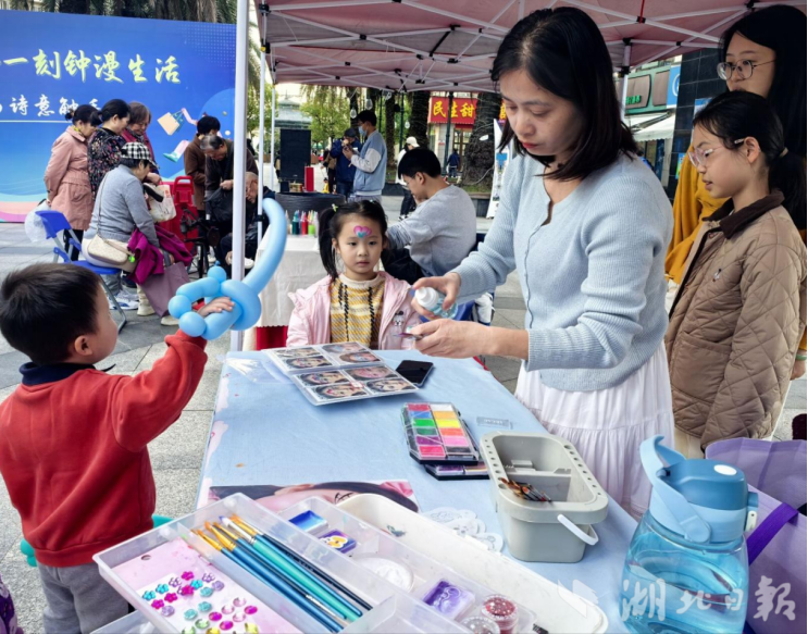 更具特色的是文化体验类摊位。深受孩子们喜爱的小丑叔叔,灵巧地扭动着手中的气球,眨眼间便变出小狗、花朵等形态各异的造型,引来阵阵欢呼;在彩绘摊位,专业彩绘师精心设计款式,一笔一画间,将童趣与创意跃然孩童脸颊;最受亲子家庭欢迎的是非遗漆扇DIY摊位,志愿者提前准备好白扇,教大家动手调漆、绘制,在扇面上留下独一无二的创意。