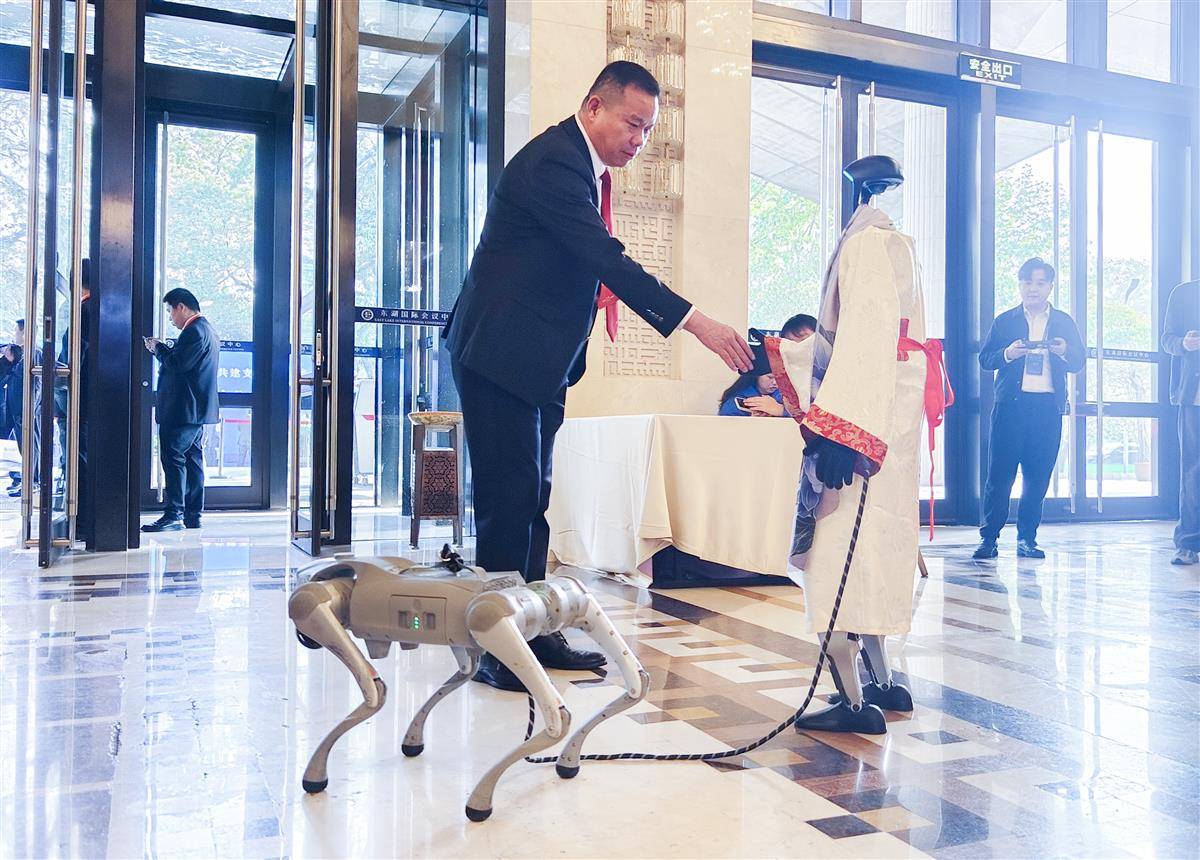 10月29日,参会楚商代表在会场外和人形机器人互动。