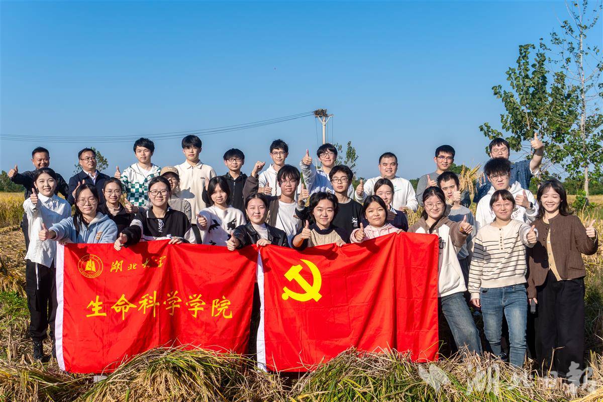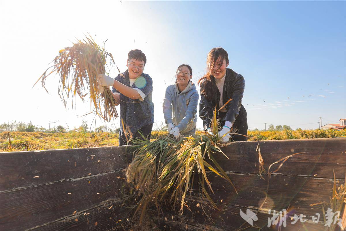 湖北大学生科院学子喜迎自家“稻米”丰收。(通讯员 刘奕喆 刘雪琪 摄)
