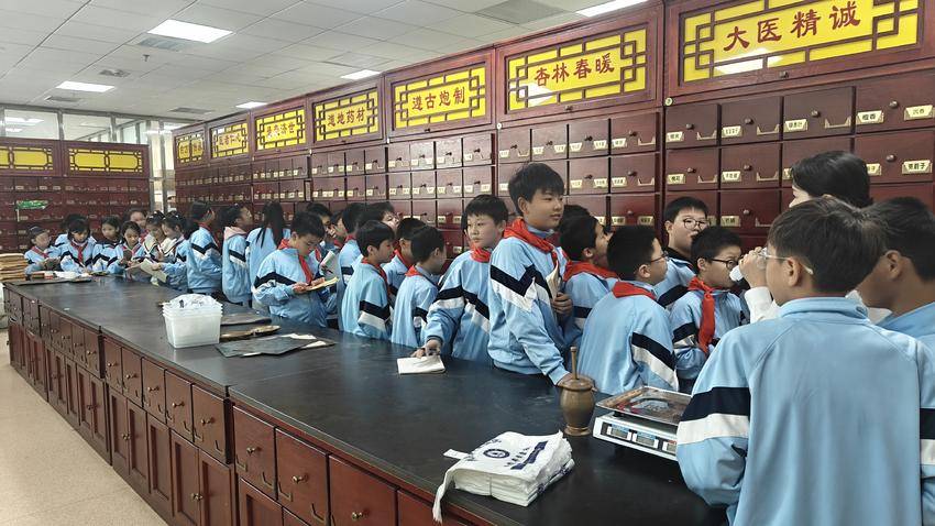 在弥漫着药香的中药房内,朱红色药柜与古朴匾额相映成趣,瞬间引起了学生们的好奇。医护人员借助实物药材,生动讲解了“君臣佐使”的中药配伍原则以及“药食同源”的生活智慧,将抽象理论化为直观认知。同学们或仔细观察药材形态,或认真记录所学,沉浸于浓厚的中医药文化氛围中。