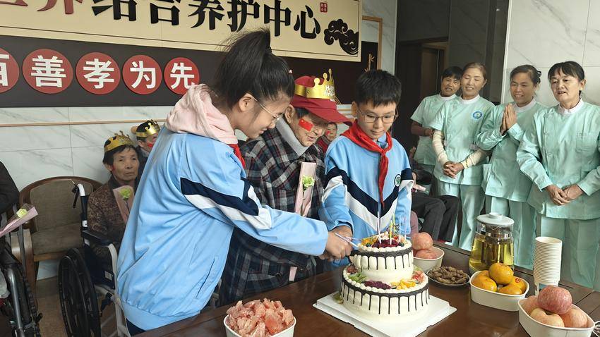 活动的温馨高潮出现在医养结合养护中心。正值重阳敬老氛围浓厚,学生们与头戴生日帽的长者们欢聚一堂,共同切分蛋糕、品尝水果、亲切交流。老少互动间,欢声笑语不断,温暖的关怀在彼此心间流淌,也让尊老敬老的美德在实践中得以传承。