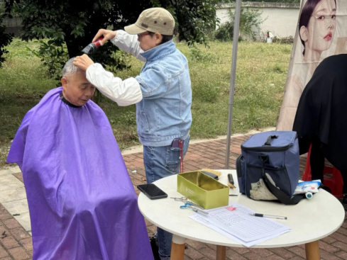 同时在爱心义剪区,志愿者理发师为老人们理出清爽利落的新发型,老人们高兴的竖起大拇指,脸上洋溢着幸福的笑容。