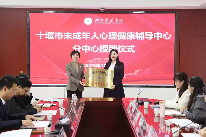 湖北日报客户端讯(通讯员 肖业鹏)2025年10月29日,“十堰市未成年人心理健康辅导中心分中心”授牌仪式在湖北医药学院科教楼举行,湖北医药学院校党委书记郑丹凤为东风七中授牌,标志着东风七中正式成为十堰市未成年人心理健康服务体系的重要阵地。