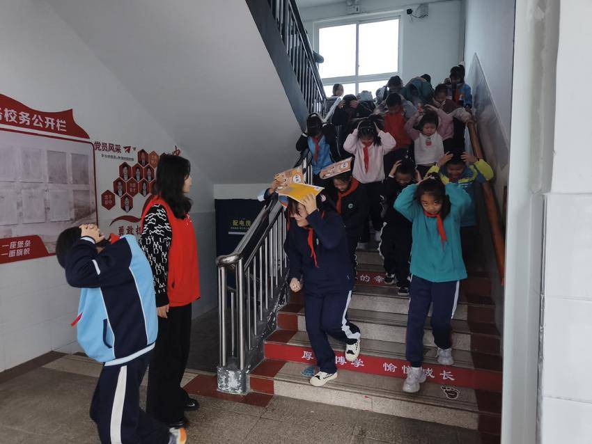 演练伊始,警报声骤然划破校园宁静。教室内,任课教师化身安全指挥官,指挥学生迅速采取避险姿势——双手抱头、蜷缩于课桌下,最大限度降低潜在伤害。紧接着,第二声疏散警报响起,师生们按照预定路线,有条不紊地撤离:他们用手护住头部,步伐紧凑却不慌乱,从教学楼各层奔向操场。中岳路社区志愿者与学校教职工并肩守护,在楼梯口和转角处维持秩序,防止拥挤踩踏,确保过程高效流畅。短短2分钟,全体师生安全集结,无一遗漏,展现了默契的团队协作与应急素养。