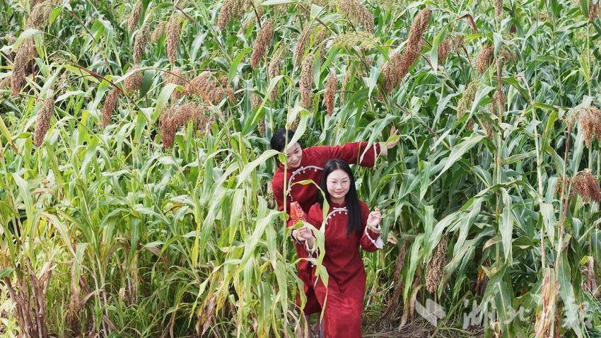 沿着栈道入口下楼梯,可以看到一条笔直的栈道铺陈在高粱地间。在大片的高粱间,只见一群身着红色旗袍的游客,拿着古风道具,正摆出各种拍照姿势,格外引人注目。一旁的摄影爱好者神情专注,手指灵活地按下快门,接连抓拍下一个个精彩瞬间。“今天天气好,我就和几个朋友约着一起来这里打卡,还遇上很多摄影爱好者,这里很出片,他们给我们拍了很多美照。”游客张玉蝶笑着说道,脸上洋溢着满足与喜悦。