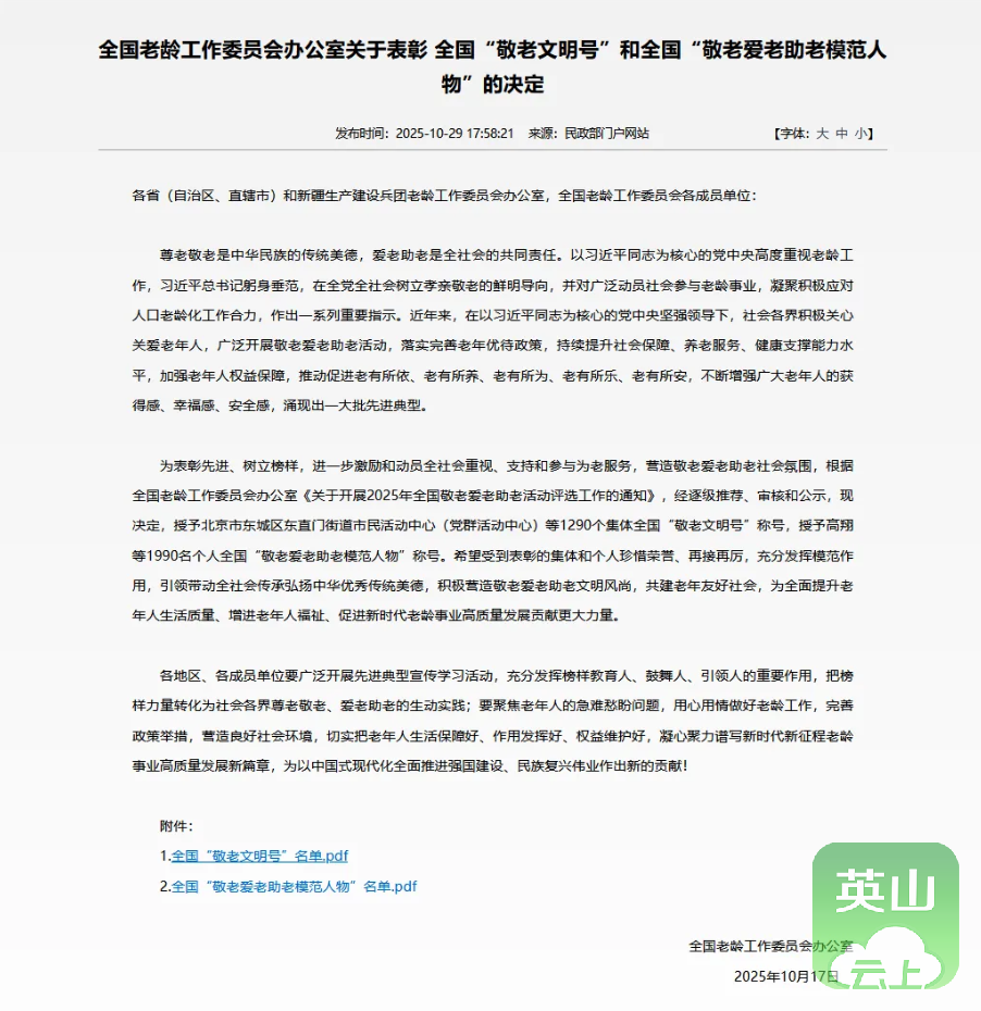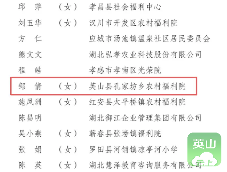 10月29日,全国老龄工作委员会办公室发布关于表彰全国“敬老文明号”和全国“敬老爱老助老模范人物”的决定,授予1290个集体全国“敬老文明号”称号,授予1990名个人全国“敬老爱老助老模范人物”称号,其中,党的二十大代表、全国先进工作者、英山县孔家坊乡福利院院长邹倩喜获表彰。