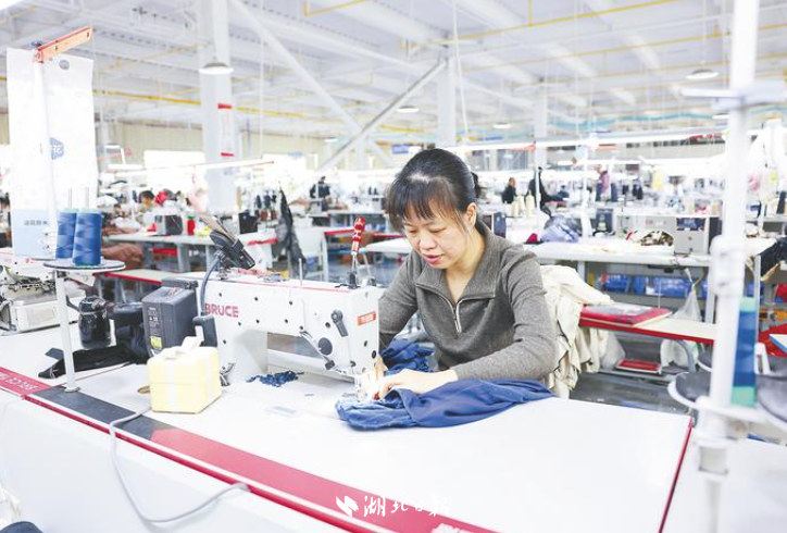 天门市伊佳鑫服饰有限公司生产车间,员工在赶制服装订单。(湖北日报通讯员 刘银斌 摄)