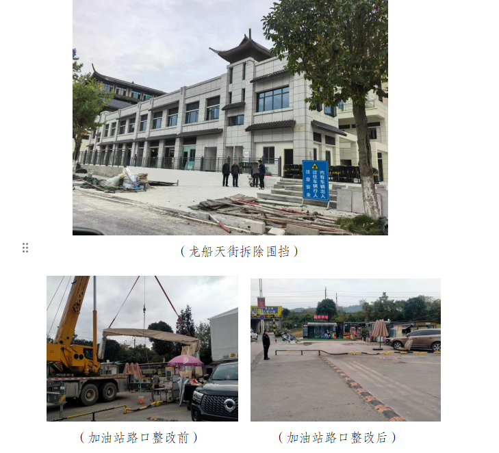 巡查期间,专班人员在龙船天街发现一处违规围挡,影响通行和市容美观,随即协调施工人员依法拆除,恢复道路畅通。在加油站路口,一处长期占道的违规钢架棚被现场制定方案并监督拆除,及时消除安全隐患。