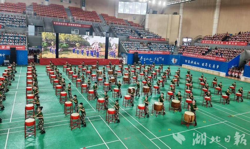 湖北日报客户端讯(通讯员天马、彭小锋)11月5日,钟祥市第七届中小学体育艺术教育“一校两特”集中展演活动在市体育馆隆重举行。冷水镇小学百人击鼓演奏的开场节目《龙腾盛世》给全市师生留下了难忘的记忆。