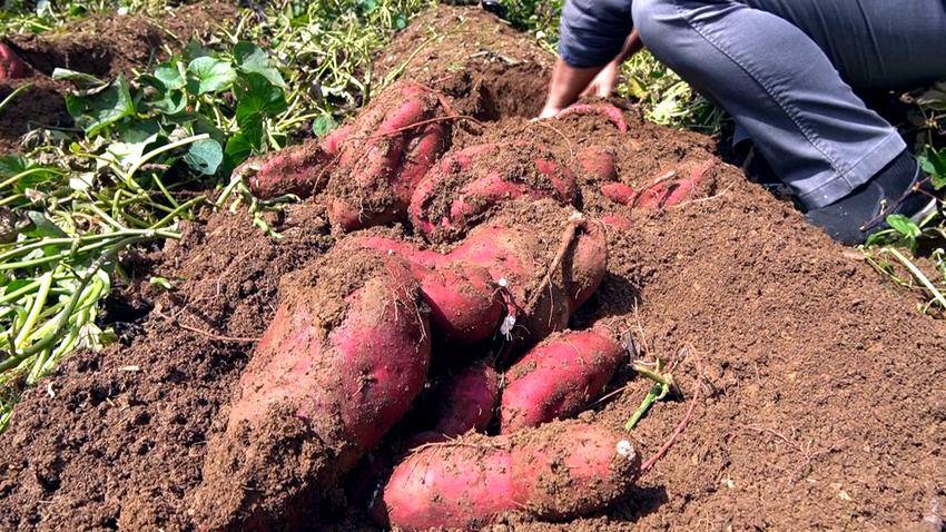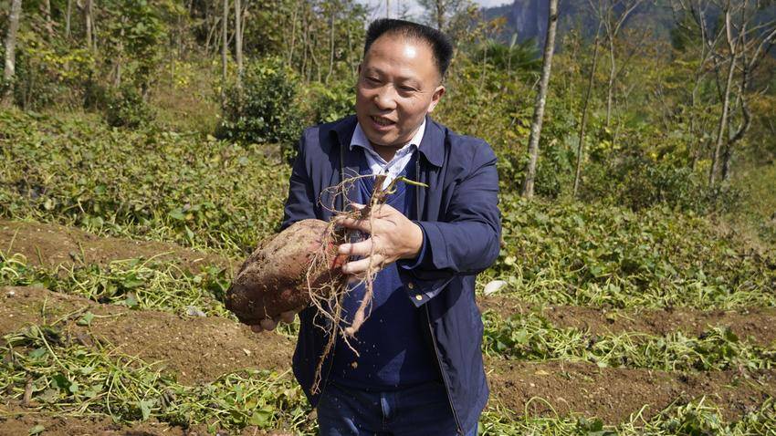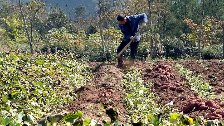 11月4日,在太平镇枞阳坡村6组,村民田林忠正在地里忙碌,新挖出的红薯堆成了小山。他今年种植了约三亩地,预计总产量可达一万五千至一万六千斤。