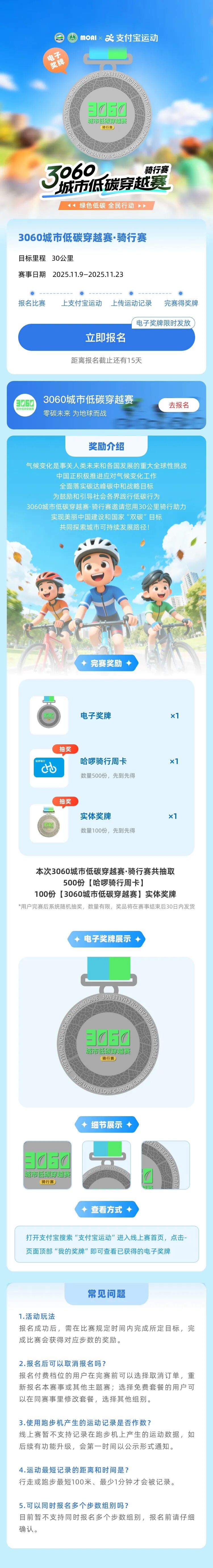 骑行赛:公众报名参加线上骑行赛,授权并上传距离记录,在活动时间内累计骑行30公里即可完成比赛并获得奖励。