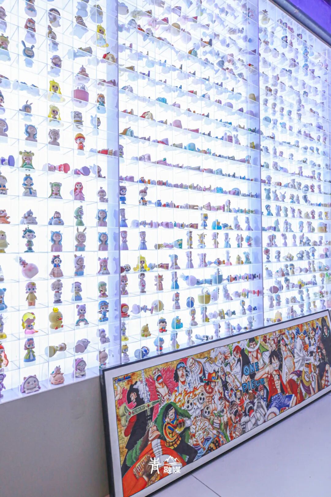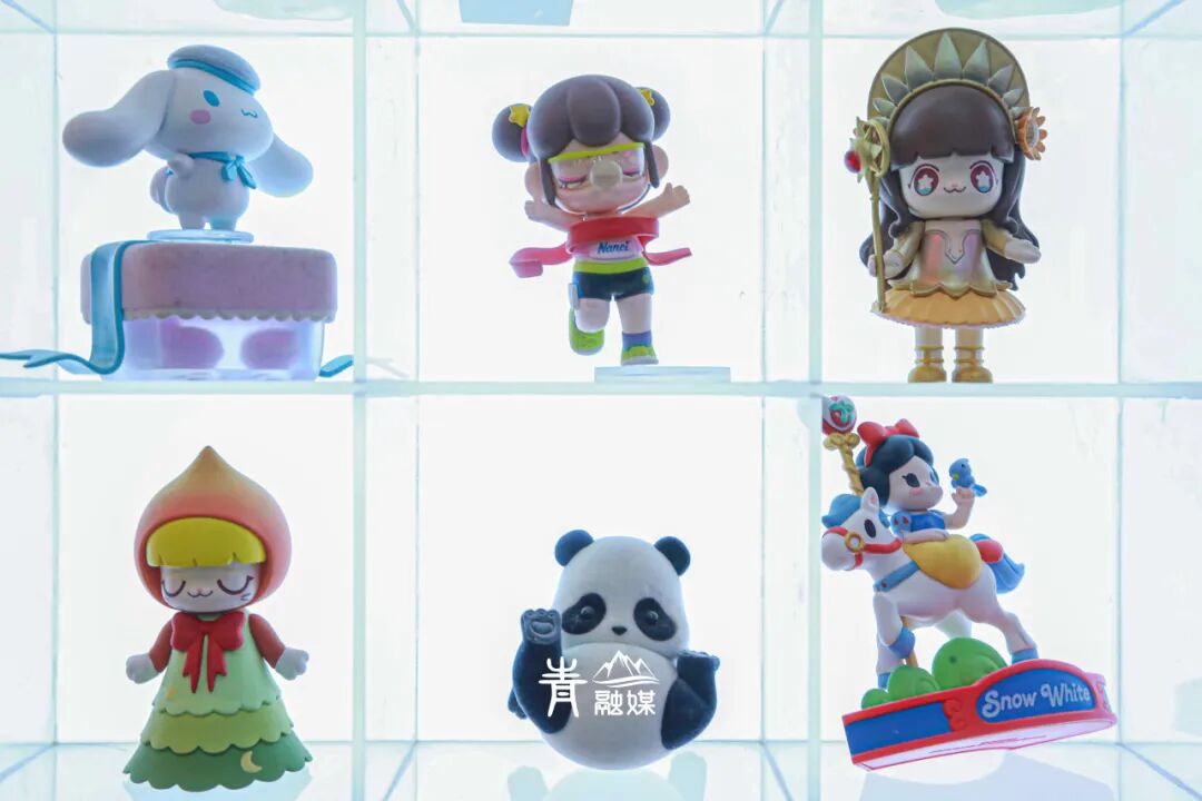 最令人震撼的是一整面墙的明盒展示区域,这是武汉迄今为止最大的一面盲盒墙。共有1200余个盲盒玩偶展示。玉桂狗等三丽鸥IP形象,泡泡玛特出品的各种盲盒,把玩起来简直是爱不释手。